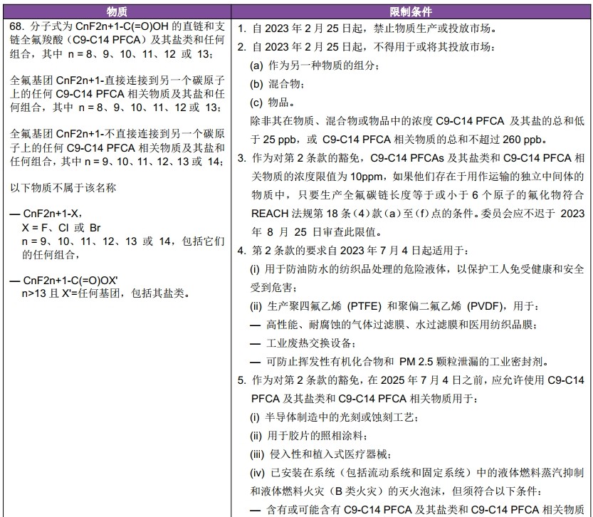 2021年8月5日,歐盟官方公報(OJ)發(fā)布法規(guī)(EU) 2021/1297,對REACH法規(guī)(EC) No. 1907/2006附錄XVII(限制物質清單)第68條進行修訂,將原第68條全氟辛酸(PFOA, 已被移入POPs法規(guī))替換為全氟羧酸(C9-C1a4 PFCAs)及其鹽類和相關物質的限制,該法規(guī)將在歐盟官方公報上發(fā)布第20天開始生效。