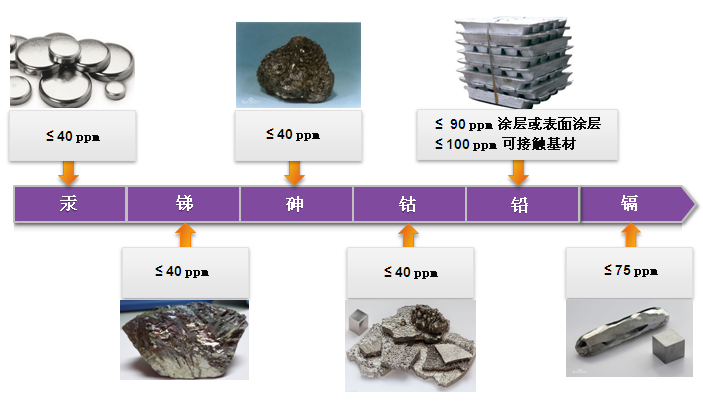 · 該項法案主要對12歲以下兒童使用產(chǎn)品中的六種重金屬(汞、銻、砷、鈷、鉛和鎘)的總含量進(jìn)行了嚴(yán)格限制。