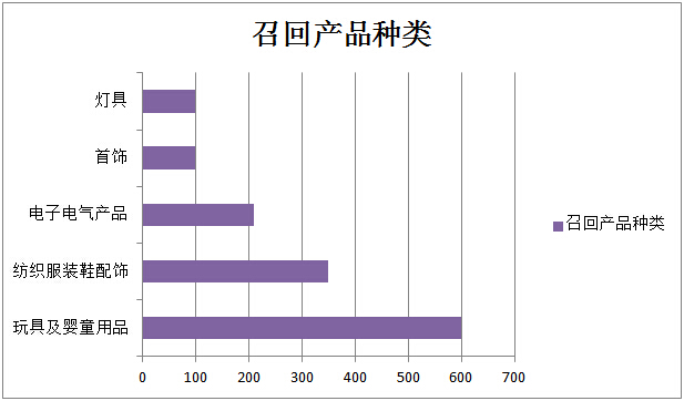 在被召回的產(chǎn)品中,玩具、嬰童產(chǎn)品類,服裝、紡織、鞋及配飾類產(chǎn)品,電子電氣產(chǎn)品類都占有很大的比例,當(dāng)然這也是我國(guó)出口的消費(fèi)品的主要構(gòu)成部分。其中玩具、嬰童產(chǎn)品類別占總召回產(chǎn)品比例逾30%,服裝、紡織、鞋及配飾類產(chǎn)品占總召回產(chǎn)品比例達(dá)20%,同時(shí)另一大塊產(chǎn)品——電子電氣產(chǎn)品的數(shù)量占總召回產(chǎn)品數(shù)量的比例也逾10%。另外,作為我國(guó)主要的出口產(chǎn)品類別的首飾及燈具類產(chǎn)品也有較高的召回比例,都占到了總召回產(chǎn)品比例的5%以上。