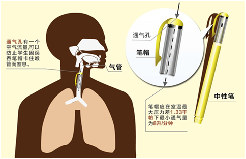 國家《學(xué)生用品的安全通用要求》明確規(guī)定,書寫筆、記號(hào)筆、修正筆、水彩筆的筆帽應(yīng)至少符合筆帽尺寸(夠大則兒童不能吞咽下去)、筆帽通氣面積(留有小孔,如不慎吞下不至窒息)或筆帽空氣流通(有掛鉤之類物體,在不慎被吞時(shí)可以保持一定的空氣流通)三項(xiàng)要求之一。