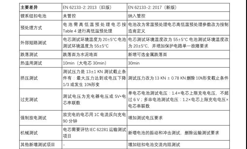 2017年5月12日,歐洲電工標準化委員會曾發(fā)布了EN 62133:2017版,分別為鎳系電池適用的EN 62133-1: 2017及鋰系電池適用的EN 62133-2: 2017。該兩版標準已于2020年3月14日起在歐洲強制實施,同時舊版(EN62133:2013版)將不被接受。
