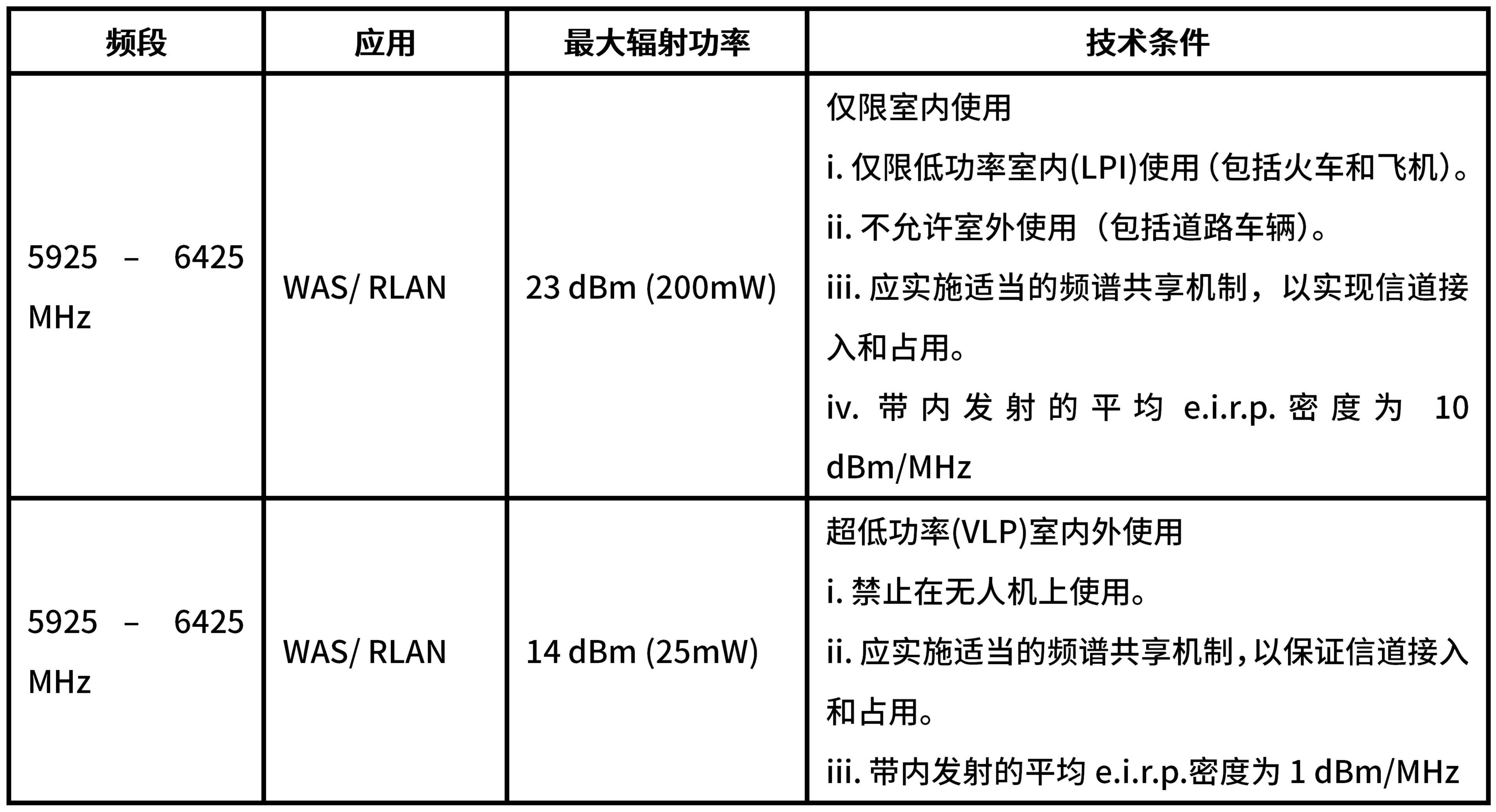1. 根據(jù)該決議,現(xiàn)5945–6425 MHz頻段已經(jīng)正式開放,附帶以下使用條件: