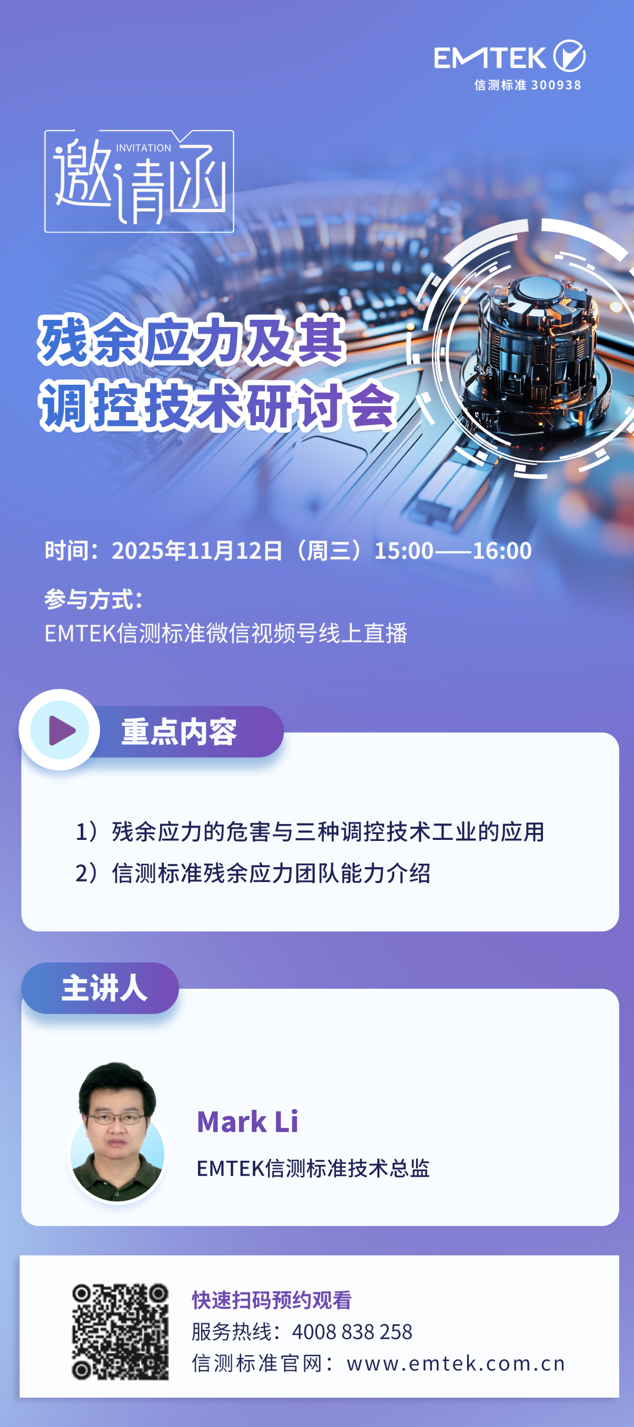 為共探應(yīng)力奧秘、共促產(chǎn)業(yè)升級(jí),11月12日下午3點(diǎn),信測(cè)標(biāo)準(zhǔn)特邀您參與“殘余應(yīng)力及其調(diào)控技術(shù)”專(zhuān)題線上研討會(huì),將從殘余應(yīng)力的來(lái)源、利弊、測(cè)量、分析評(píng)價(jià)和調(diào)控等方面,與國(guó)內(nèi)廣大材料領(lǐng)域科技人員、檢驗(yàn)者及設(shè)備廠商進(jìn)行溝通與交流,共同促進(jìn)我國(guó)殘余應(yīng)力技術(shù)的進(jìn)步,助力中國(guó)智造邁向新高度!歡迎預(yù)約,提前鎖定精彩!
