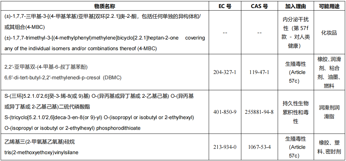 2022年1月17日,歐洲化學(xué)品管理局(ECHA)將最新一批共四種物質(zhì)正式加入到SVHC候選物質(zhì)清單。至此,SVHC候選清單共包括26批223項(xiàng)物質(zhì)。最新被納入清單的四種物質(zhì)涉及到化妝品、橡膠、潤(rùn)滑劑和密封劑等領(lǐng)域,對(duì)人類生育能力和環(huán)境均有損害。
