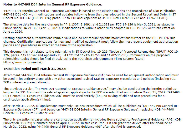 2021年11月底,F(xiàn)CC官網(wǎng)發(fā)布KDB 447498 D04 Interim General RF Exposure Guidance v01 (以下簡(jiǎn)稱(chēng)V07版) 過(guò)渡期射頻暴露指導(dǎo)文件。