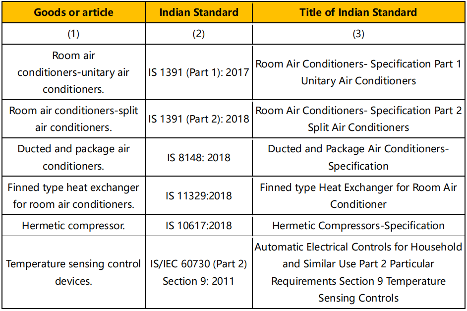 2022 年 12 月 21 日,印度 BIS 發(fā)布公告,空調(diào)及相關(guān)設(shè)備零件,密封壓縮機(jī)和溫度傳感控制器產(chǎn)品強(qiáng)制安規(guī) ISI 認(rèn)證的實(shí)施時間再次推遲實(shí)施,下列產(chǎn)品的強(qiáng)制日期推遲到 2023 年 10 月 1 日。