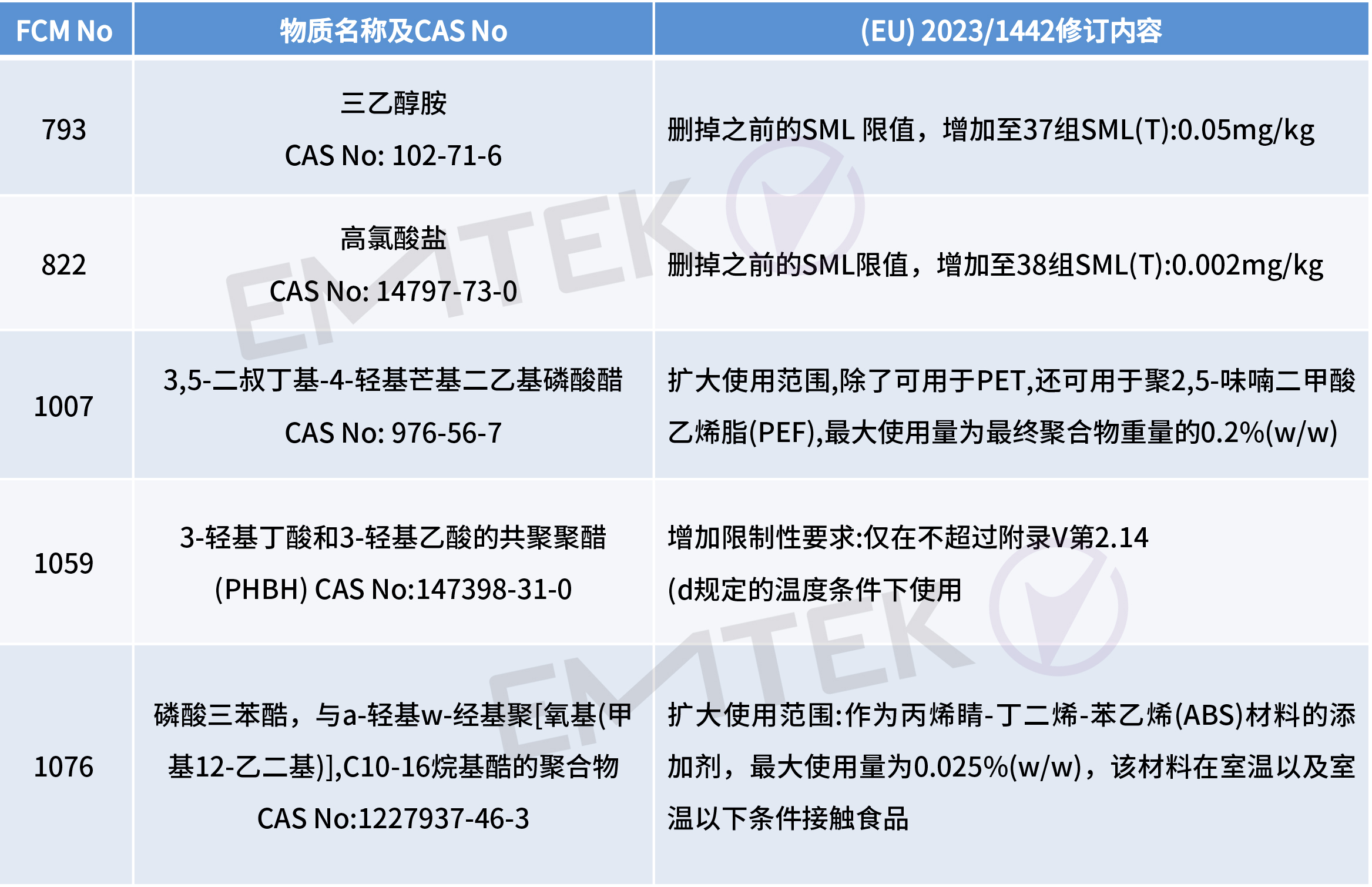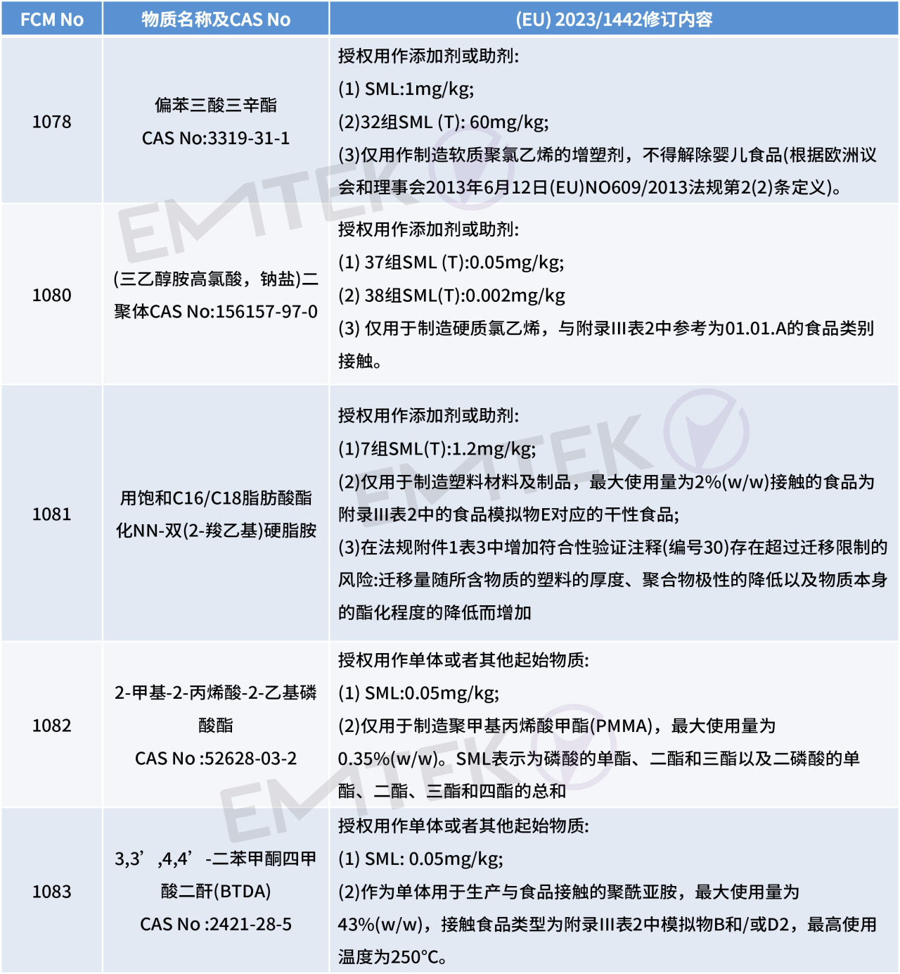 2023年7月12日,歐盟官方公報發(fā)布塑料食品接觸材料法規(guī)(EU) No 10/2011的最新修訂法規(guī) (EU) 2023/1442。新法規(guī)將于2023年8月1日生效,新法規(guī)針對附件I中部分授權(quán)物質(zhì)進行刪減,修訂及新增。