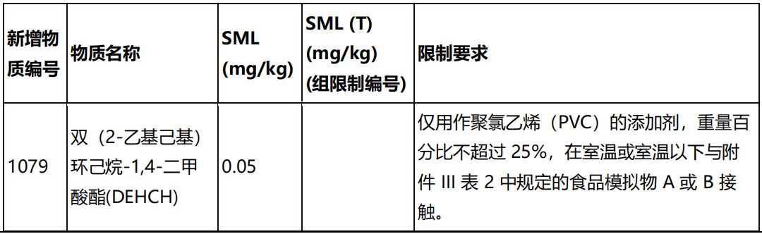 2023 年 8 月 11 日,歐盟委員會在其官方公報發(fā)布修訂案(EU)2023/1627,以修訂食品接觸材料塑料法規(guī)(EU)10/2011 附件 I,新增 1,4-環(huán)己烷二羧酸二異辛酯(DEHCH)的授權(quán)。該修訂案將于2023年8月31 日生效。