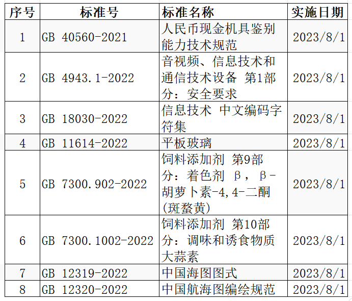 2023 年7 月消息,自2023 年8 月1 日起,8 項強制性國家標(biāo)準(zhǔn)、9 項推薦性國家標(biāo)準(zhǔn)開始實施,具體標(biāo)準(zhǔn)名單如下: