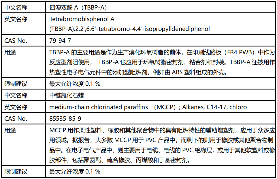 ? 2021 年,歐盟 RoHS 評估機(jī)構(gòu)發(fā)布 Pack15 的最終評估報告,建議將 TBBP-A 和 MCCPs 納入RoHS 限制。