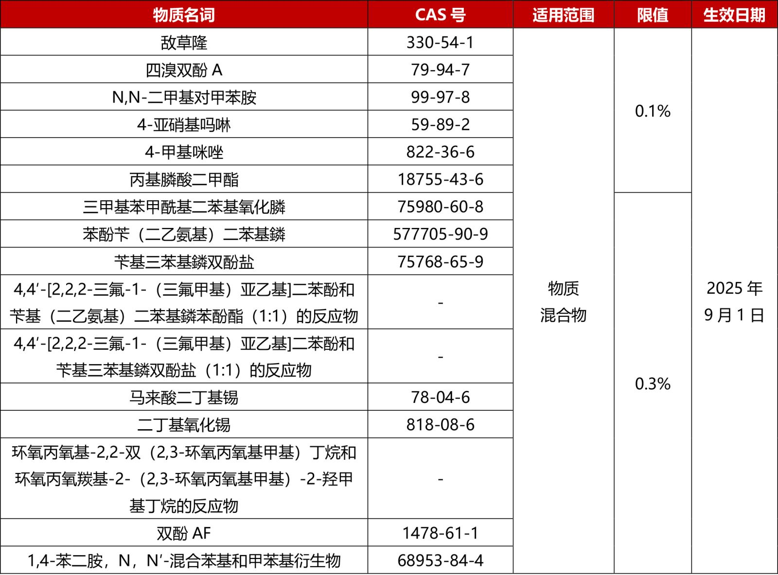 2025年9月1日,歐洲化學(xué)品管理局(ECHA)對3項(xiàng)SVHC意向物質(zhì)展開公眾咨詢。公眾咨詢將于2025年10月16日結(jié)束,在公眾咨詢期結(jié)束前,各利益相關(guān)方均可向ECHA提交評議意見,ECHA將對反饋意見進(jìn)行評議,通過評議的物質(zhì)將被正式加入SVHC候選物質(zhì)清單。