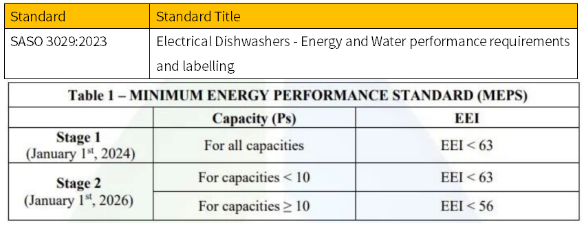 沙特電動(dòng)洗碗機(jī)產(chǎn)品將開(kāi)始實(shí)施能效標(biāo)準(zhǔn)第二階段要求